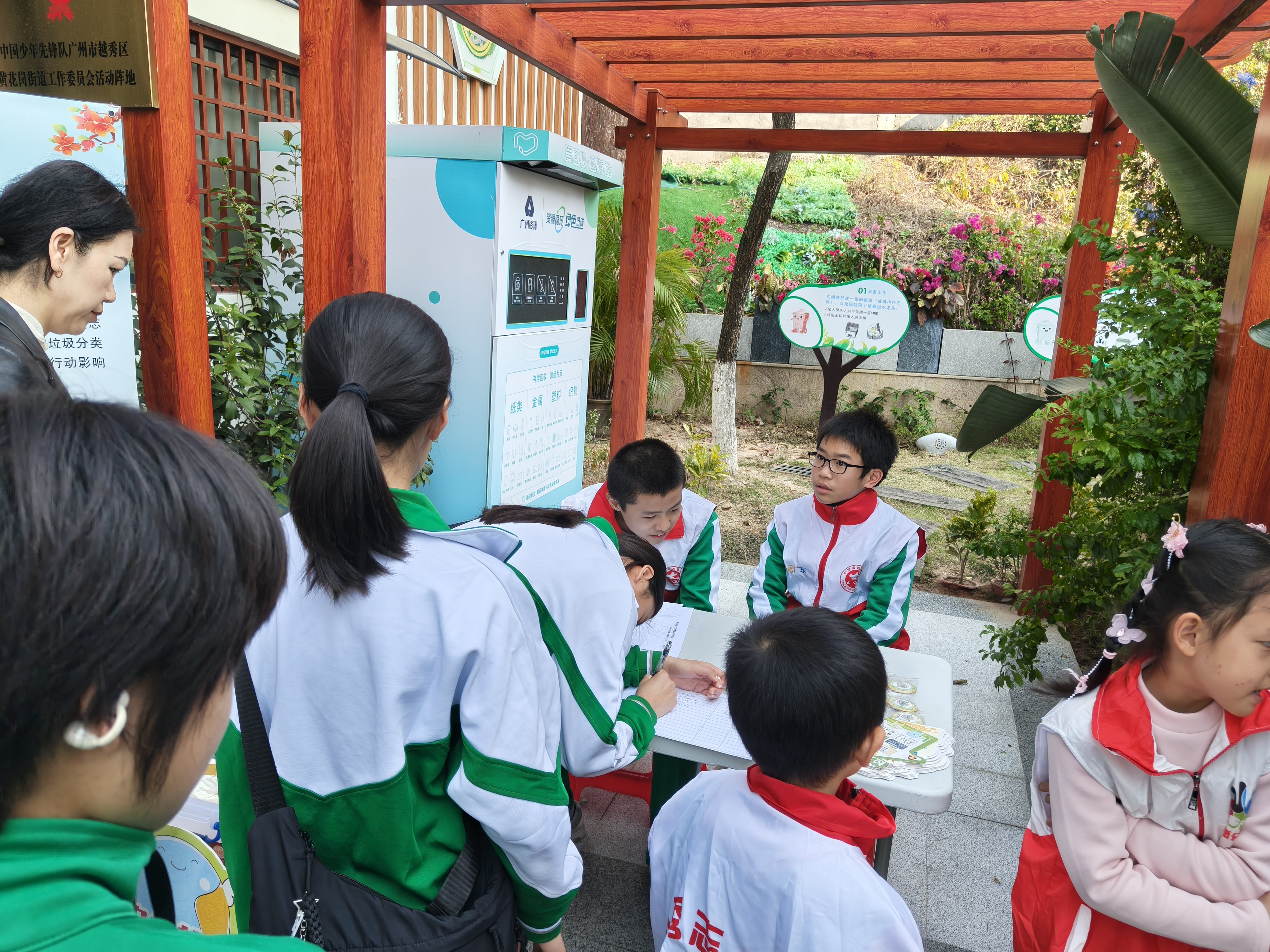 每天上午9点半,博览园准时迎来第一批小志愿者。他们被分配到不同岗位:有的担任“博览园引导员”,为参观者指引路线;有的化身“垃圾分类小小讲解员”,在展板前自信讲解;有的成为“旧物捐赠登记员”,认真记录每一份爱心捐赠。